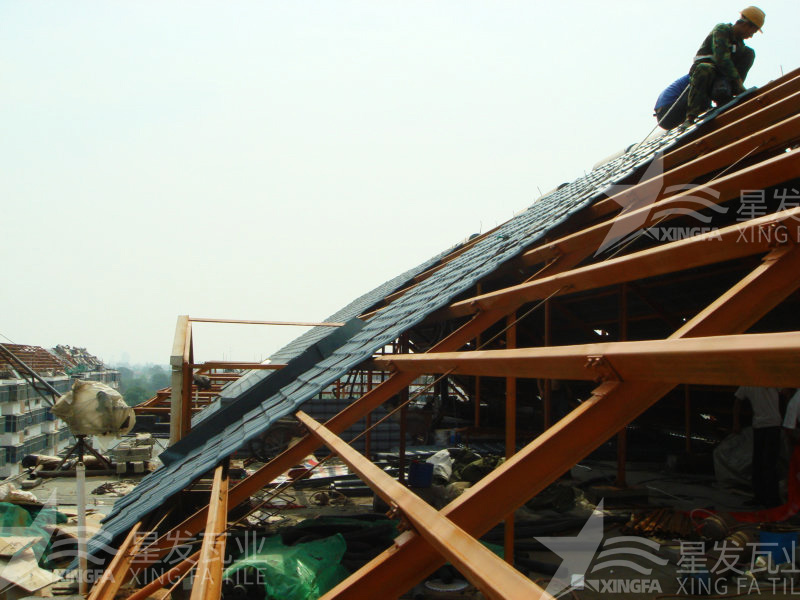 一、施工简单方便:相比过去使用的小青瓦或水泥瓦,树脂瓦的施工过程更加简单方便。只需将旧瓦片拆除,修复原有屋顶,节省了人工成本。
